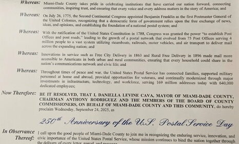Miami Area Local Attains Proclamation Honoring USPS 250 from Miami-Dade County Commission