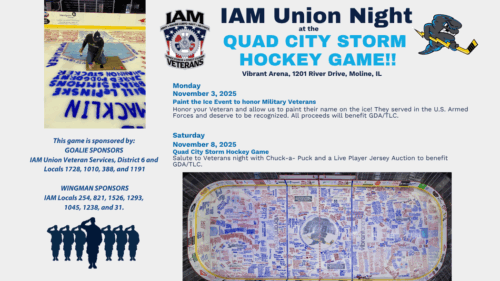 Locals and Districts of the IAM Midwest Territory are proud to again sponsor a special “Salute to the Military” Quad City Storm hockey game on Saturday, Nov. 8, 2025, at Vibrant Arena in Moline, Ill. This IAM Union Hockey Night will feature Chuck-a-Puck, a live player jersey auction, and tributes to veterans — with all