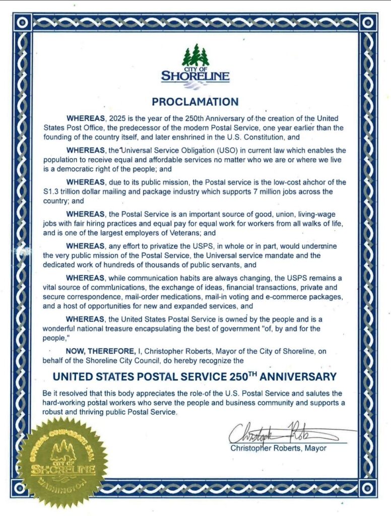 The post Mayor of Shoreline, WA, Signs Proclamation Celebrating 250 Years of Public Postal Service appeared first on American Postal Workers Union.