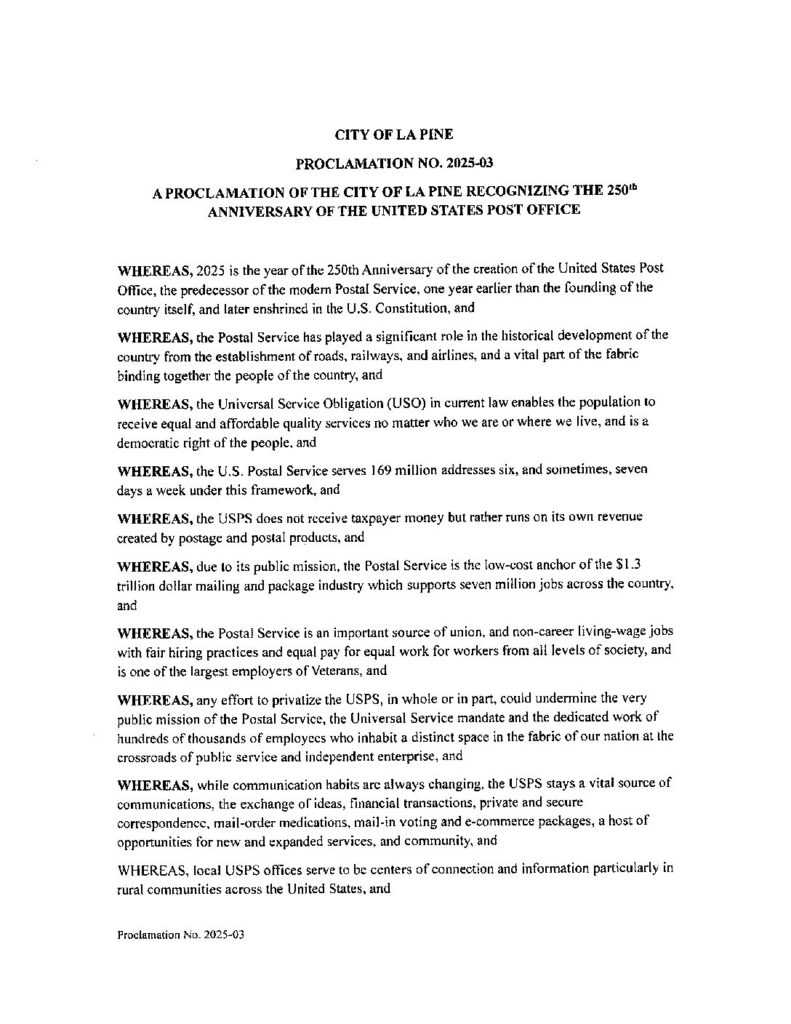 The post Oregon Town of La Pine Honors USPS 250th Anniversary with Signed Proclamation! first appeared on APWU.