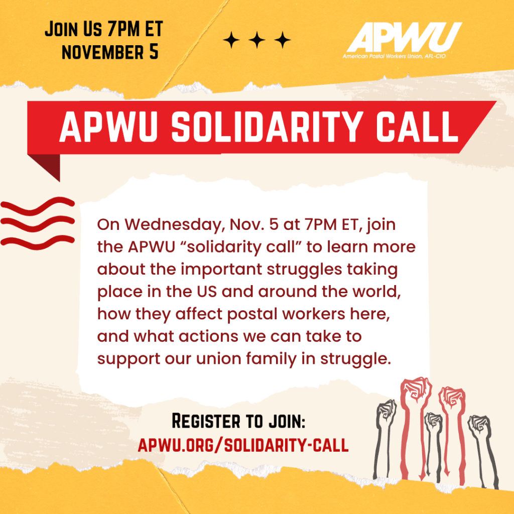 On Wednesday, Nov. 5, 2025, at 7 p.m. ET, APWU President Mark Dimondstein is hosting a “Solidarity Call” webinar for our members to hear more about the important fights taking place in the United States and around the world, how those fights affect postal workers, and what actions we can take to support our union family in struggle.