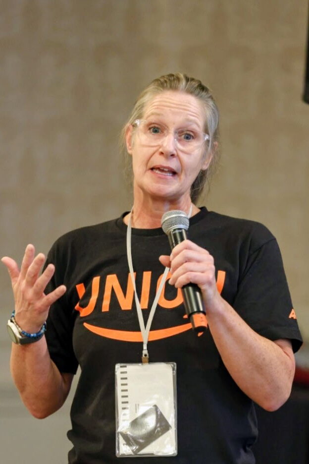 Masterson then spoke about her fight in Bellingham, where management has blanketed the facility in anti-union messages. They are directly attacking the APWU, saying we are a “government” union and don’t care about making lives better for Amazon workers, which, she countered, couldn’t be further from the truth. Laurie’s conclusion brought the room to a standing ovation: the strength and solidarity that APWU is building to help organize Amazon workers makes winning a union there “inevitable.”